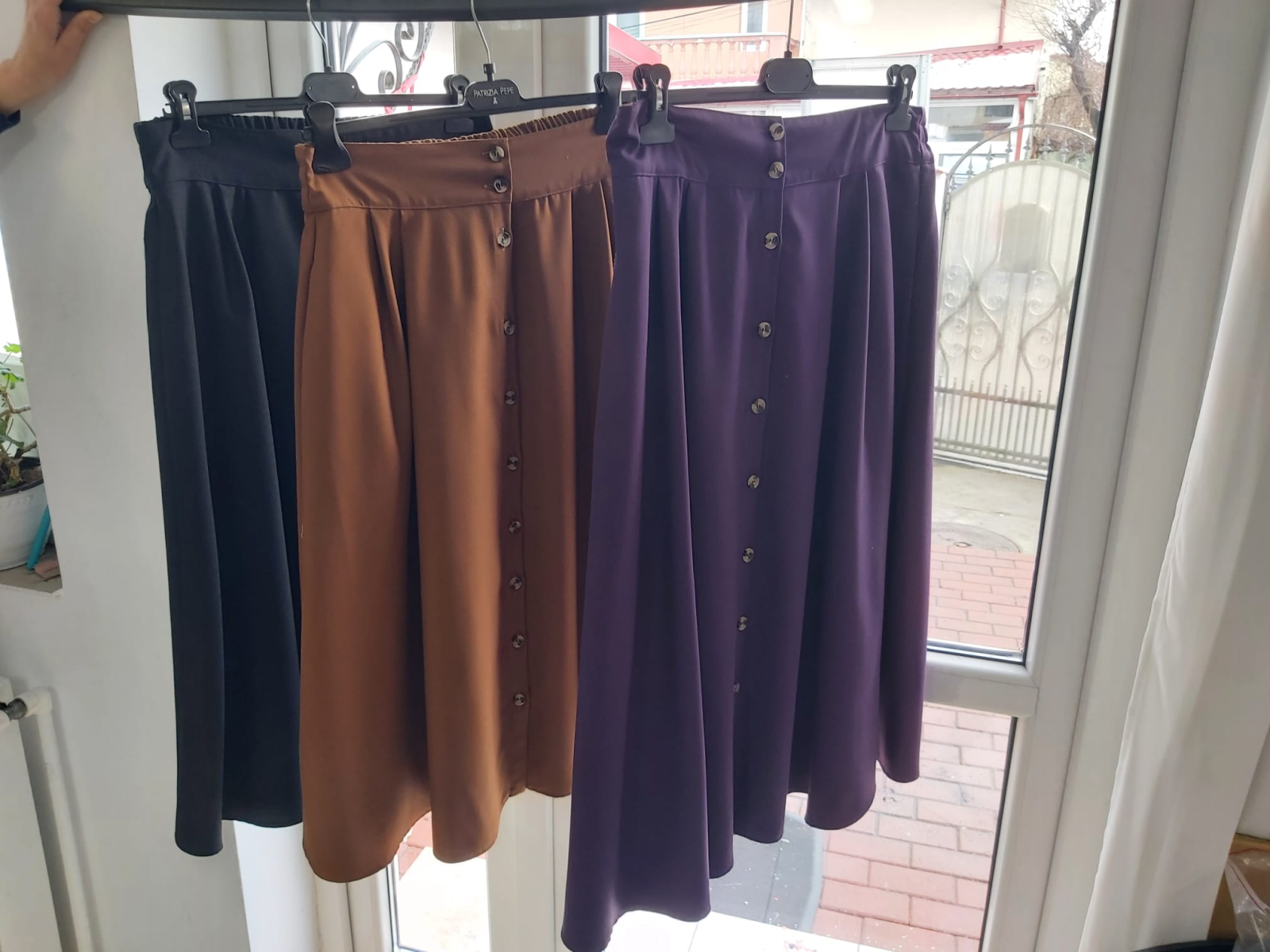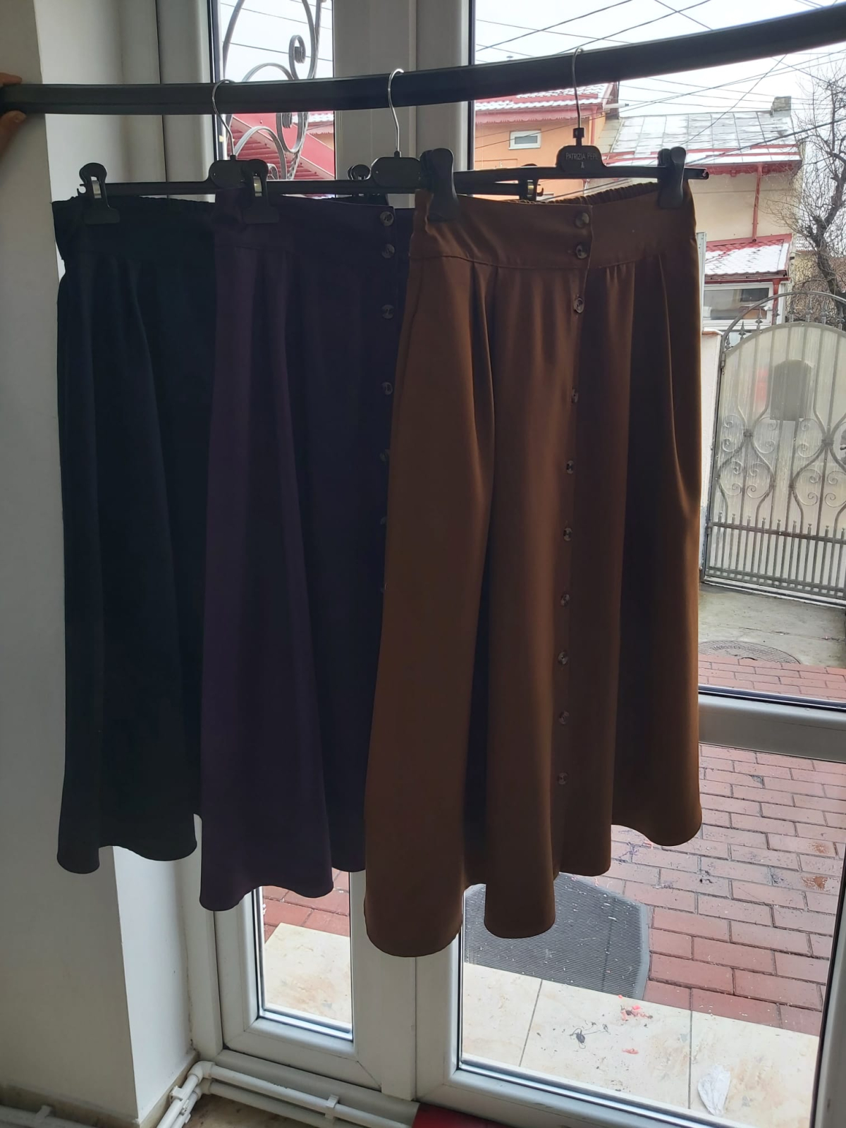 Descoperă eleganța simplă și versatilitatea acestei fuste din gabardină, disponibilă în nuanțe moderne de mov, bej și negru. Designul este completat de nasturi decorativi aplicați de sus până jos, care adaugă un plus de stil și rafinament.