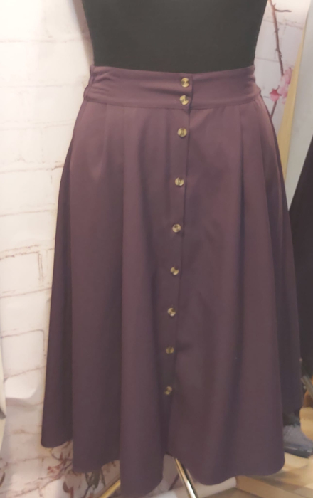 Descoperă eleganța simplă și versatilitatea acestei fuste din gabardină, disponibilă în nuanțe moderne de mov, bej și negru. Designul este completat de nasturi decorativi aplicați de sus până jos, care adaugă un plus de stil și rafinament.