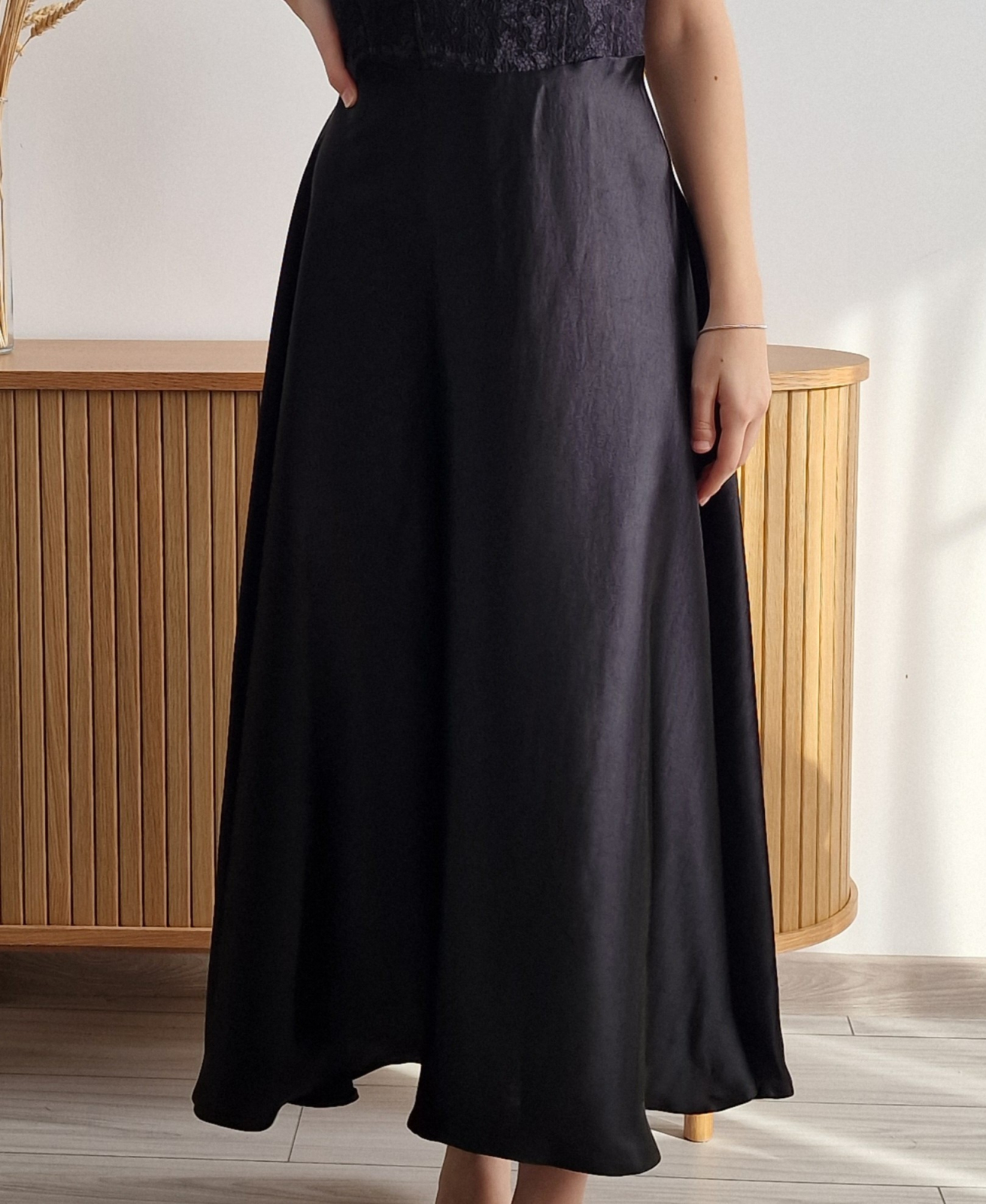 Fusta cade sub genunchi, iar materialul satinat reflectă ușor lumina, creând o senzație de fluiditate și eleganță. Este ideală pentru evenimente semi-formale sau pentru o apariție deosebită în fiecare zi.