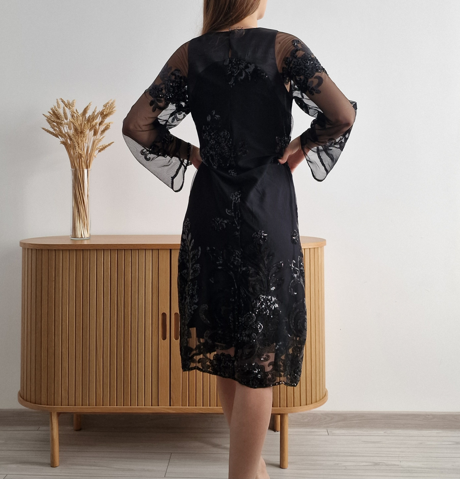 Rochie din dantelă neagră, elegantă, cu mâneci lungi transparente, croi rotund la gât și model floral delicat. Jupă peste genunchi, dantelă până sub genunchi.